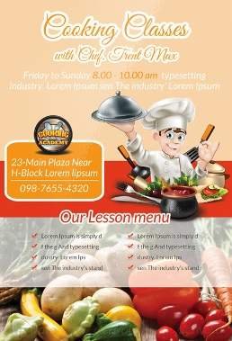 A cooking flyer template is a very attractive flyer which aims to provide information about either cooking classes or competitions. The food industry is one of the most growing industries as far as the food business is concerned. We are witnessing the opening of new restaurants either chains of famous brands or by an individual, to attract new as well as existing customers, with their unique and delicious food dishes. Moreover, this increasing number of restaurants is causing tough competition in the market. To remain in position within this completion, most of the restaurants offer various attractive packages to retain their existing customers. These offers depend on their surroundings, market norms, customer behavior and the financial position of the restaurant. The most common technique used by these restaurants, is to offer cooking classes for cooking lovers. Although it is not proven effective, it attracts many new customers.