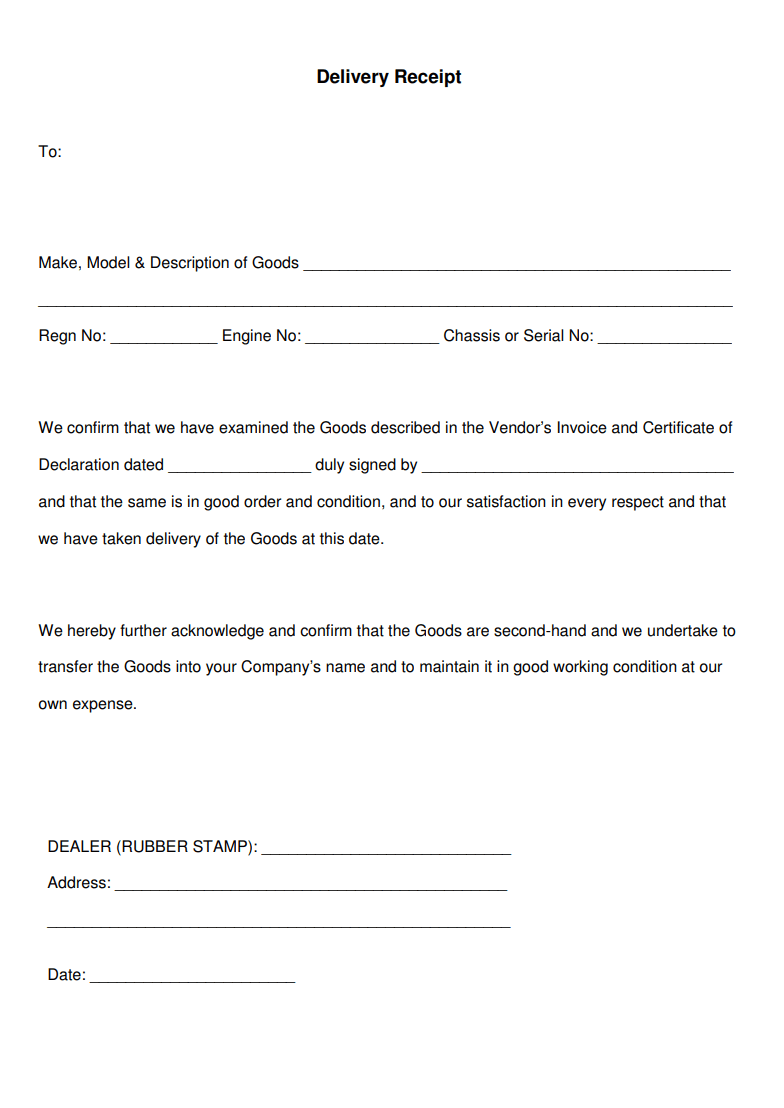 A delivery receipt template is a document used to insure the delivery of package and signed by the person on receiving goods. It shows they have been delivered a document which was sent by someone from a courier service. Usually, a delivery receipt is used for the confirmation of receiving mail, letter, logging equipment and for many other professional shipments. The delivery receipt is a notification of delivery and also called a delivery note which is supposed to be put in the shipped package, along with the ordered products. Generally, it includes the following information, like date, time, address, and type of goods. Moreover, this format shows the logo of your shop at the top of the receipt and also describes the content or material. A delivery receipt is an extensive document proving that a person has received a letter or parcel and also expresses its type and quantity. Furthermore, it is used in many businesses, companies, organizations and for many other professional transmissions.