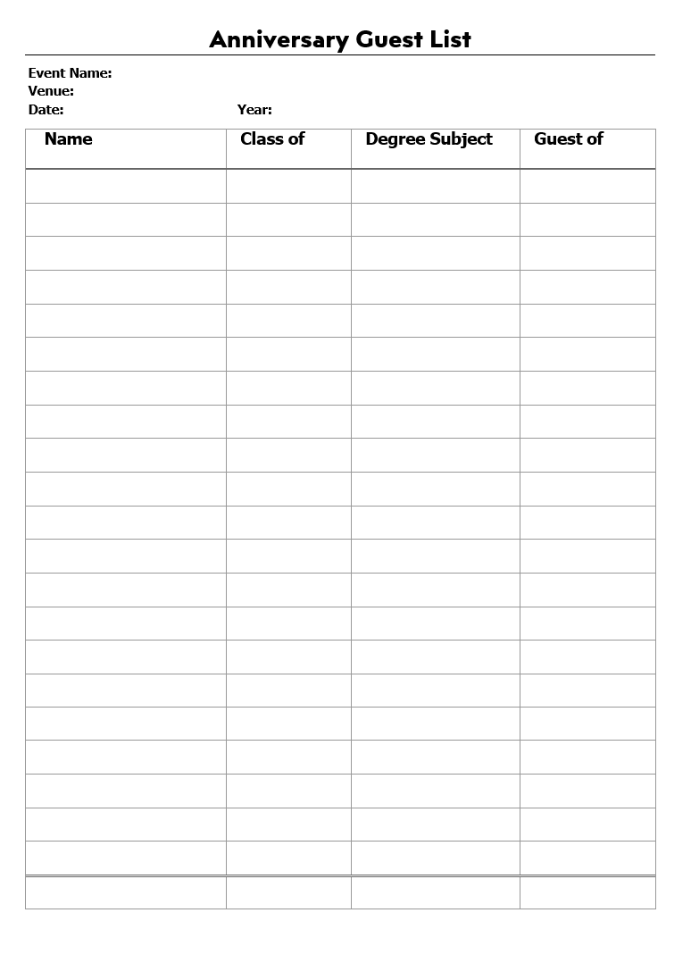 A guest list template is a document prepared for an event in which the names of invited people are mentioned. It depends upon the list of people who are invited to a marriage ceremony, birthday party, musical party and other functions or events in which people get together and meet. Moreover, the guest list can help with management by giving estimates of the number of people participating in an event. As far as different segments of a guest list are concerned, it depends upon you and your relationships, like friends, cousins, neighbors, colleagues, partners, classmates, teachers, and office staff members. People often remember only those with whom they have a better relationship with and wish to see them at their party or event. The purpose of inviting your guests is to share your happiness with them.