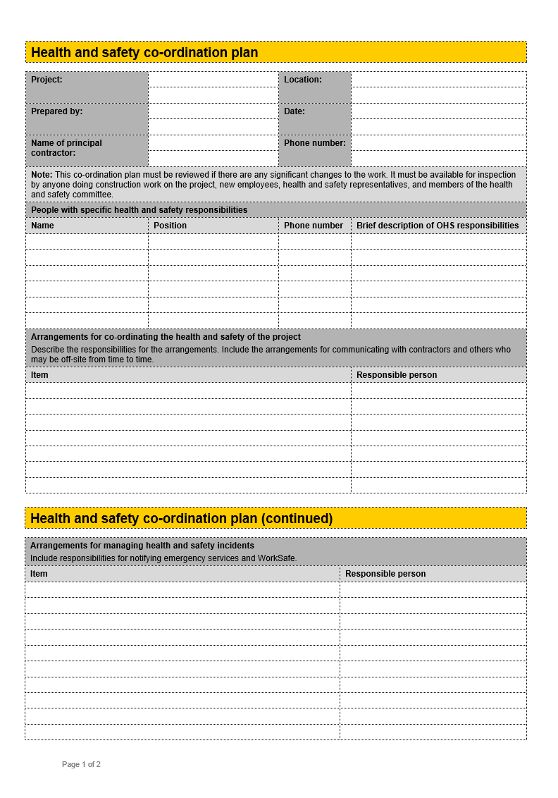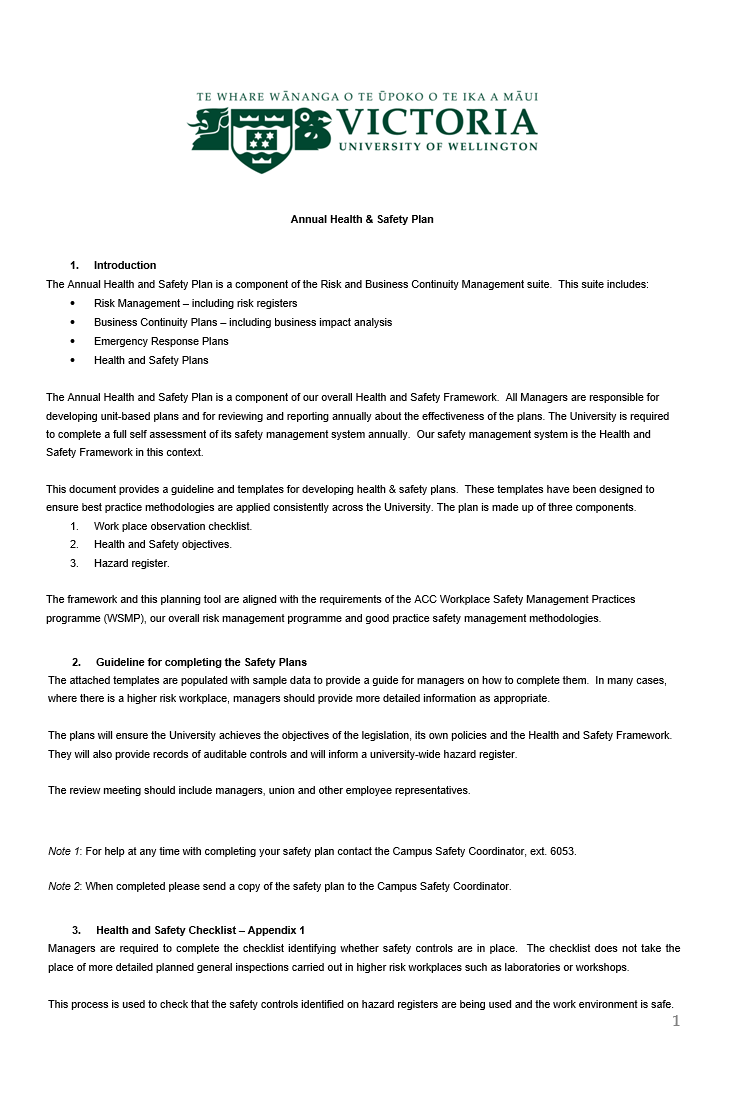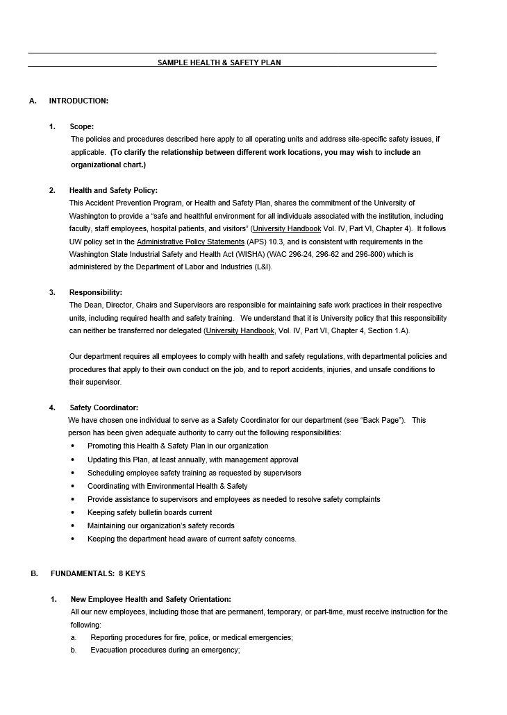 A health and safety plan template is a long-term plan which describes the process for determining physical and health threats. The purpose of determining these threats is to avoid harm to workers in the workplace, accident-preventing procedures, and mitigation steps when accidents arise. Basically, it is a plan of actions designed to prevent occupational diseases and hazards. In other words, a safety plan is a demonstrated practical plan which can help you to avoid dangerous situations and also to know the most ideal approach when you are in danger. Moreover, the basic elements of a health and safety plan include management commitment, employee involvement, work site analysis, hazard prevention, its control, safety and health training. If you have fewer than five employees, there is no need to generate a health and safety plan. This guideline makes your life easier for you by presenting the basic information about your needs. A policy must include a statement with reference to the responsibilities of the employer, supervisors and other workers.