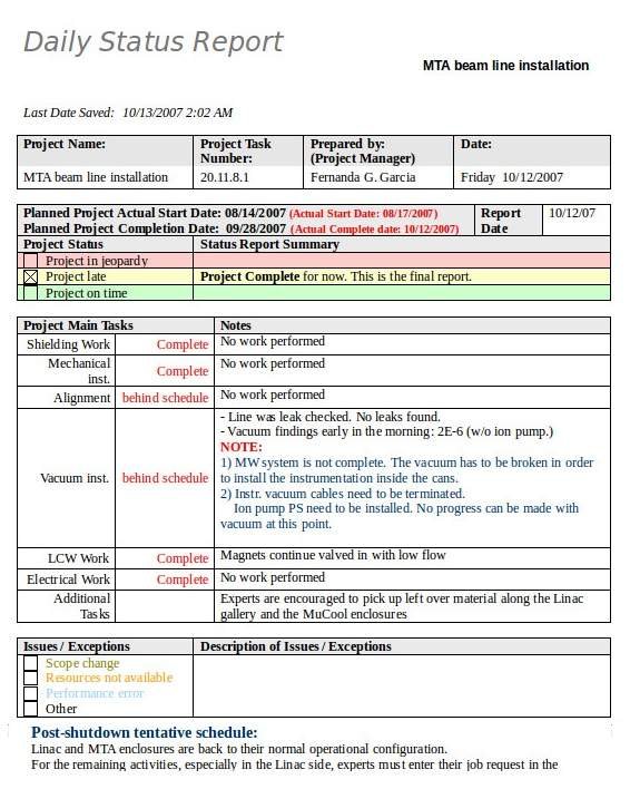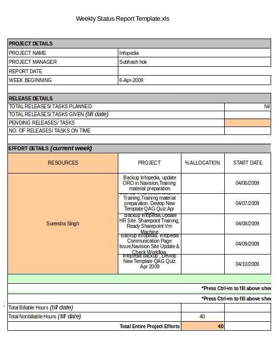 A status report template is an exclusive document which is prepared between the project manager and the client. It shows the present position and condition of the project and describes the beneficial components and circumstances of the project. Basically, the status report summarizes an appropriate situation for the current period of time which is mentioned in the status report. Moreover, it is an element of the project control process and can be used for multiple purposes in businesses and other professional institutions. The ultimate purpose of using a status report is to ensure the implementation of the objectives by the measuring of progress with the focus on planning. This way, it provides an efficient and effective report which communicates with the documented history of the project. Furthermore, a status report template is a business document that needs to be updated timely. It showcases the present and accurate picture of the business or task for which it is regularly prepared. All these circumstances are presented by the employee to their superior and serve as crucial means of communication by prepared any report affiliation.